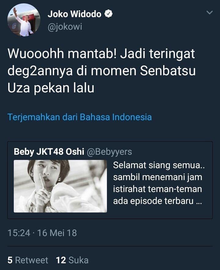Akun Twitter resmi Presiden Jokowi yang beralamat di @jokowi tersebut, sempat memposting sebuah tweet yang berisi tentang salah satu grup idol JKT48.