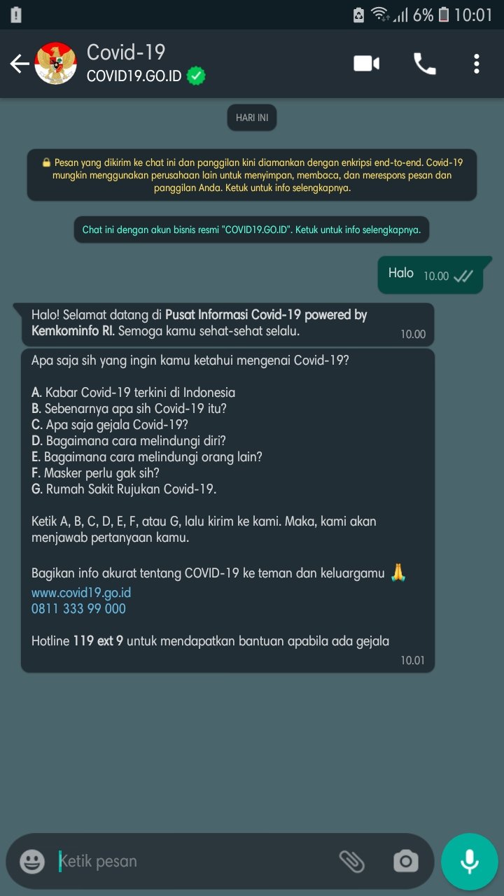 - Nantinya, secara otomatis chatbot tersebut akan memberikan balasan pesan awal yang akan mengarahkan pengguna untuk memberikan perintah berdasarkan huruf untuk mengetahui informasi terkini soal wabah Covid-19.