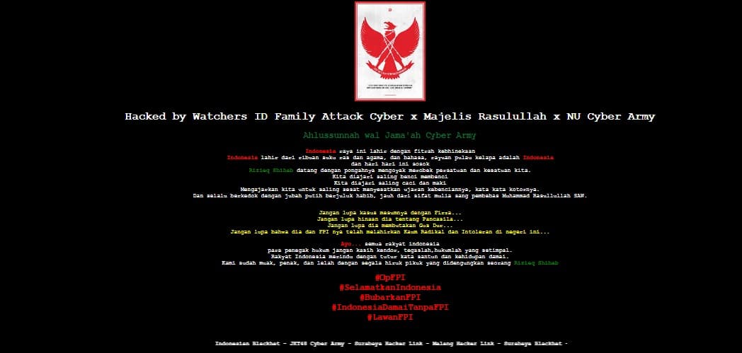 “Ayo… semua rakyat indonesia. Para penegak hukum jangan kasih kendor, tegaslah, hukumlah yang setimpal. Rakyat Indonesia merindu dengan tutur kata santun dan kehidupan damai. Kami sudah muak, penak, dan lelah dengan segala hiruk pikuk yang didengungkan seorang Rizieq Shihab,” demikian isi pesan yang dimuat pada halaman depan situs yang diretas tersebut.