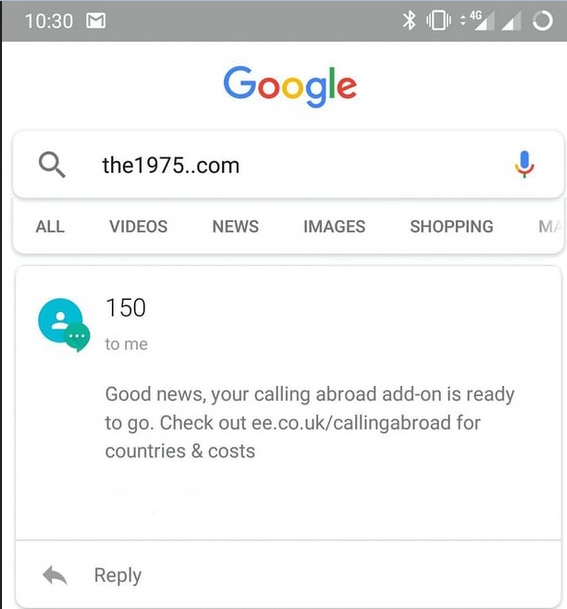 recode.ID – Ketika pengguna mengetikan kata the1975..com pada kolom pencarian maka hasil yang di tampilkan bukannya artikel atau informasi mengenai band asal Inggris tersebut, namun hasil yang muncul justru sms terakhir yang tersimpan dalam perangkat tersebut.
