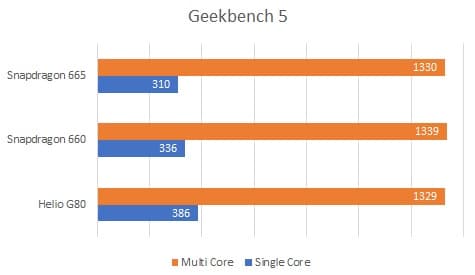 Dari hasil pengujian didapatkan fakta bahwa Mediatek Helio G80 ternyata unggul di sisi single core. Sementara untuk skor multi core, kedua SoC ini baik Helio G80 maupun Snapdragon 665 dan 660 menunjukan hasil yang sama.