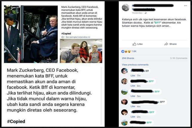 “Mark Zuckerberg, CEO Facebook, menemukan kata BFF, untuk memastikan akun Anda aman di Facebook. Silahkan mengetik BFF di kolom komentar facebook, Jika terlihat hijau, akun anda dilindungi. Jika tidak muncul dalam warna hijau, ubah kata sandi Anda segera karena mungkin diretas oleh seseorang. #copied.”