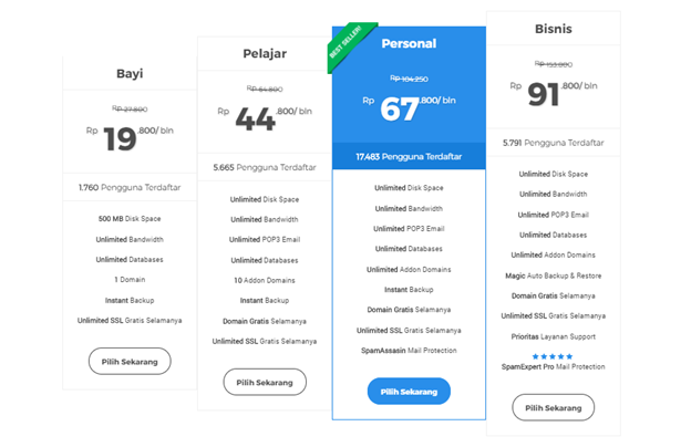 Bagi sebagian orang, fasilitas yang ditawarkan Paket Bayi kurang memadai untuk website. Di Niagahoster, layanan yang paling banyak digunakan oleh para pengguna adalah Paket Personal. Hanya dengan mengeluarkan uang Rp 67.800,- per bulan Anda sudah bisa mendapatkan layanan hosting dengan fitur unlimited disk space & bandwidth, unlimited POP3 email, domain gratis selamanya, unlimited SSL gratis, serta SpamAssassin mail protection.